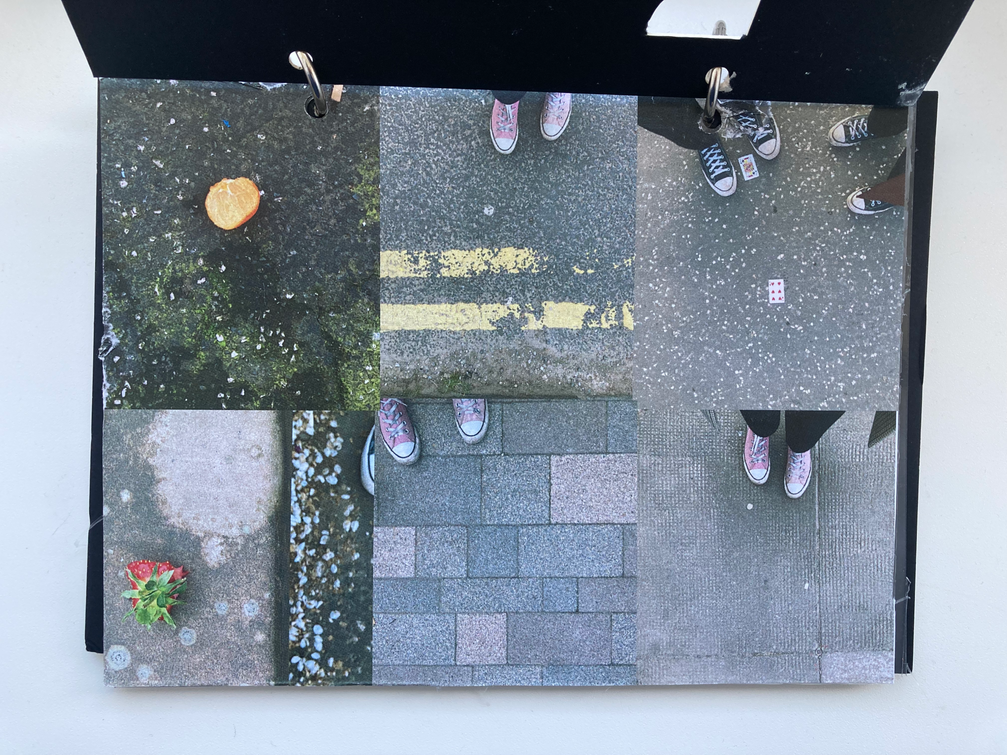 Lõikasin kaardi sisse väikesed aknad, millest järgmisele leheküljele kleepisin kollaazi piltidest, mille oma jalutuskäikudel tol tänaval tegin.