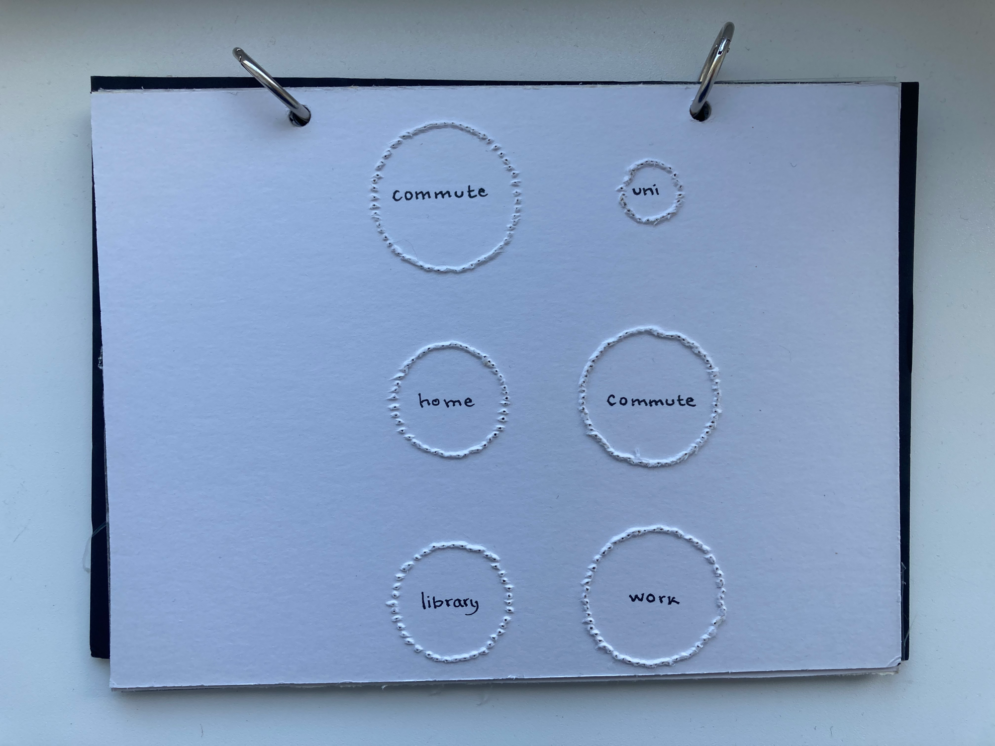 Selle projekti käigus koostasin isikliku kaardi, mis kujutab minu tavapäraseid marsruute nädala lõikes, kui elasin Glasgow’s. Projekti käigus analüüsin suhet isikliku kogemuse ja andmete vahel, lisades marsruutidele subjektiivseid andmeid, mis kajastavad minu isiklikku kogemust linnaruumis ja igapäevases elus. Viin andmete visualiseerimise ekraanist eemale ja kasutan lõppformaadis hoopis tuttavaid materjale - pappi ja paberit - mis illustreerivad andmete võimet kajastada lisaks objektiivsele ka subjektiivset ja isiklikku.